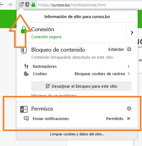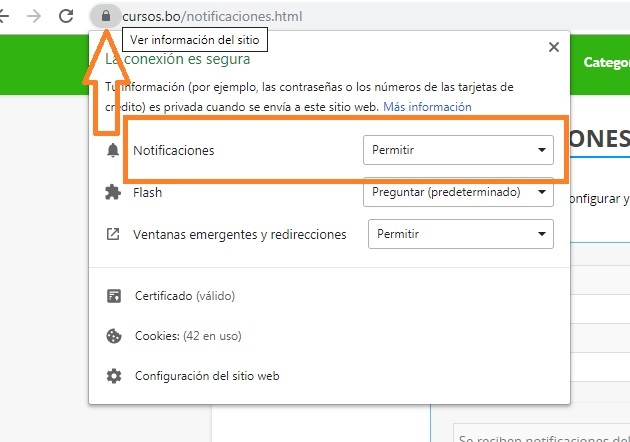 Para poder recibir notificaciones primero debes permitir al navegador recibir notificaciones de CURSOS.COM.BO, este proceso se produce al ingreso inicial a la página, en caso de no haber habilitado el premiso en ese momento, se debe habilitar el permiso manualmente como se muestra en la siguiente imagen: